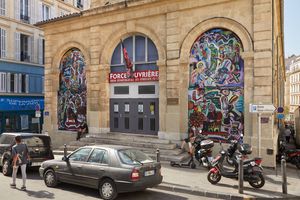 The work Embouteillagesis a series of paintings on both sides of the Metro Station Noailles, unfolding an archive of images collected onsite, processed through the artist’s imagination. During his artistic residency, Yassine Balbzioui set up a workshop in the market of Place des Capucins: a crossroad of stories, encounters and tensions. The artist opened himself up to interactions and confrontations in order to construct narratives based on a combination of people’s stories and his own imagery.