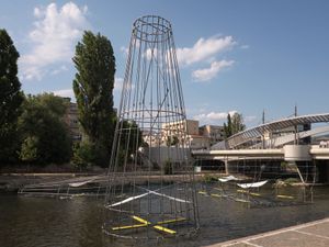 Greville’s What Is Here is a bridge embodied by the people themselves. Installing a frame in the middle of the river, the artist invites citizens from both sides of the city to swim in a relay of solidarity, together against the current. Meanwhile the action is watched over by two flags which present renderings of the surrounding terrain but claim no territory.