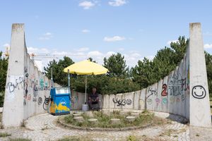 Now more of a playground than a site of remembrance, its status is widely contested. Within the walls of this now dilapidated monument to martyrs and heroes, Sislej Xhafa has assembled the elements of an alternative narrative: a dysfunctional petrol pump, a chair, a solar panel charger, a mobile phone and a paid attendant. Entitled frosted pocket, the new story unfolds over the 100 days of Manifesta 14 Prishtina.