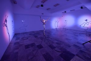 These creaturely “portals of transformation”, as Ismaili calls them, consist of long threads conjoining the performers with metal sculptures and repositories of sound. Here original songs composed by the artist intertwine with a plethora of fragments sourced from art, popular culture and politics.